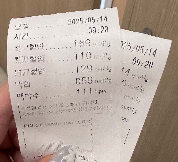 최고혈압 169 / 최저혈압 110 / 맥박수 111 이 나왔고 고장난 것만 같았는데 아니었다. (주륵)
