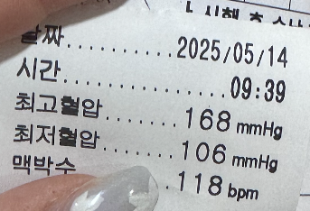 최고혈압 168 / 최저혈압 106 / 맥박수 118 이 나왔다. 하하하하.. 헛웃음은 커녕 불안이 엄습해왔다.