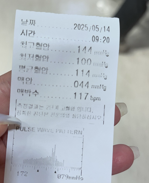 최고혈압 144 / 최저혈압 100 / 맥박수 117 이 나왔다. 최저혈압이 100이 넘으면 보통 2단계 고혈압이다.